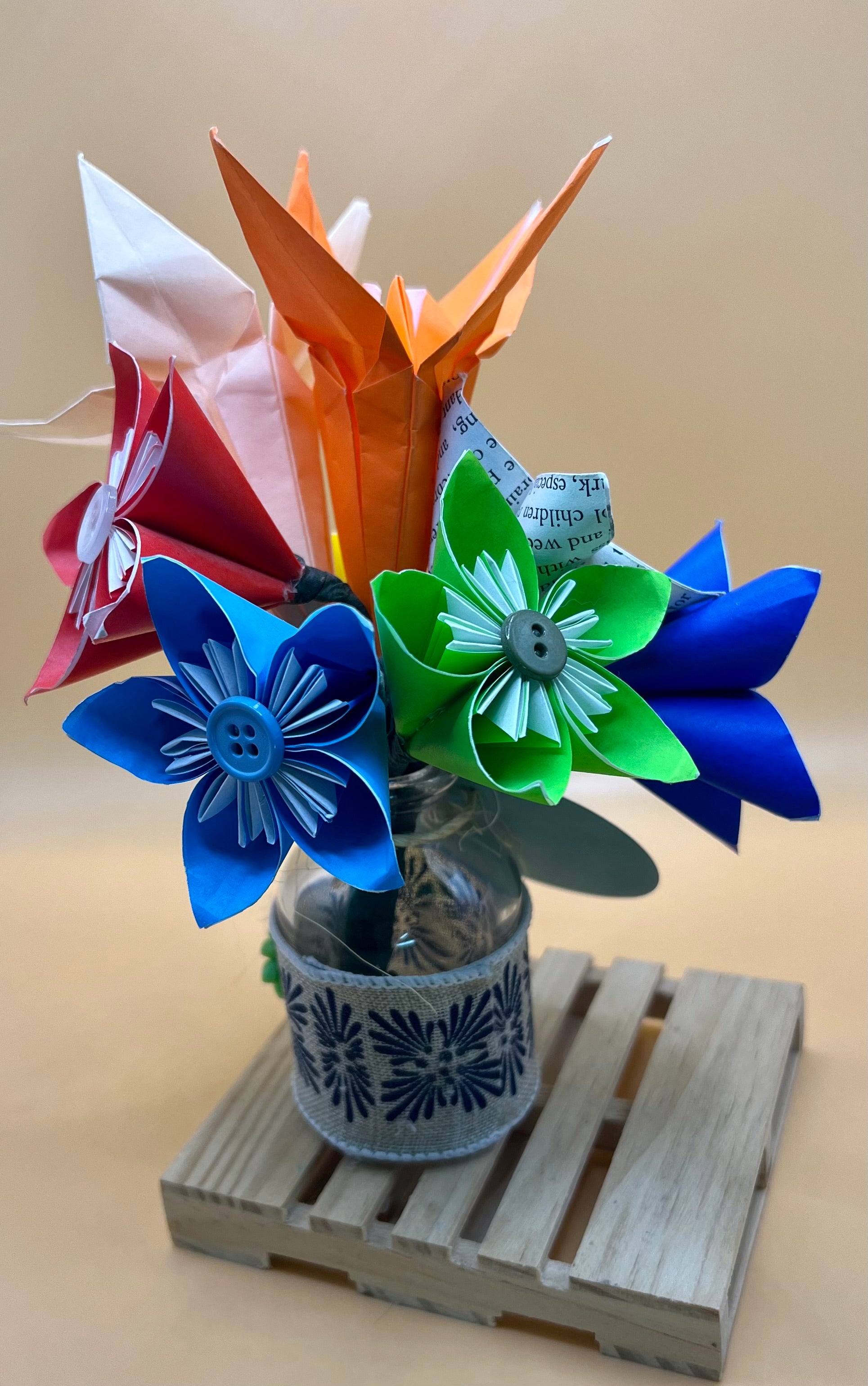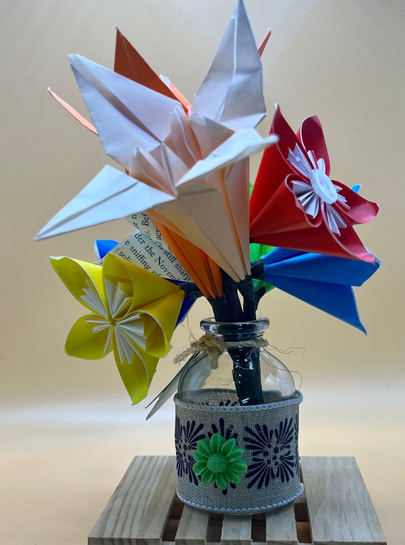 All petals are hand-folded and may vary in size. Flowers may shift or become slightly bent during shipping. We do our best to package and secure these delicate bouquets. Measurements are an approximate size.