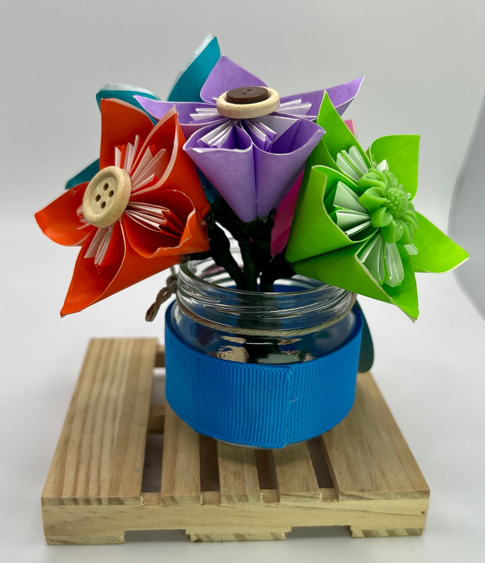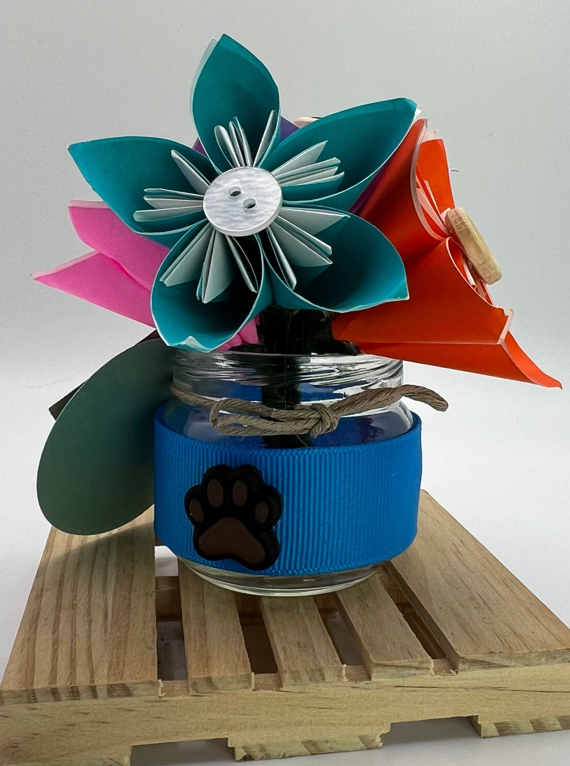 Five flowers in a variety of colors. One type of flower in different sizes. Vase is a glass jar with a paw print button and blue ribbon.