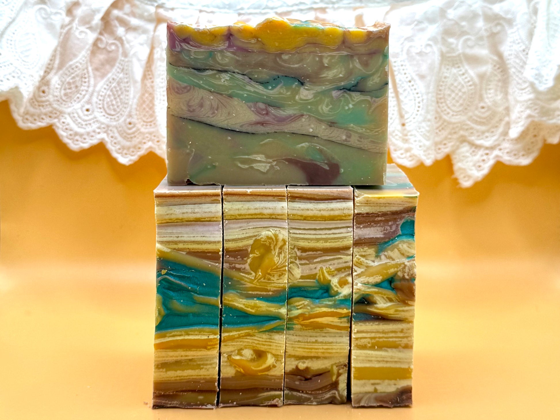 What I like about it: I was going to market this as a holiday fragrance but I love it so much it fits in my shop all year long! It's got a sneaky feather swirl and it's made with tallow so it puts in in the top five for me. I'm willing to bet this one will be a best-seller. If you like the confetti soap, you'll like this one.