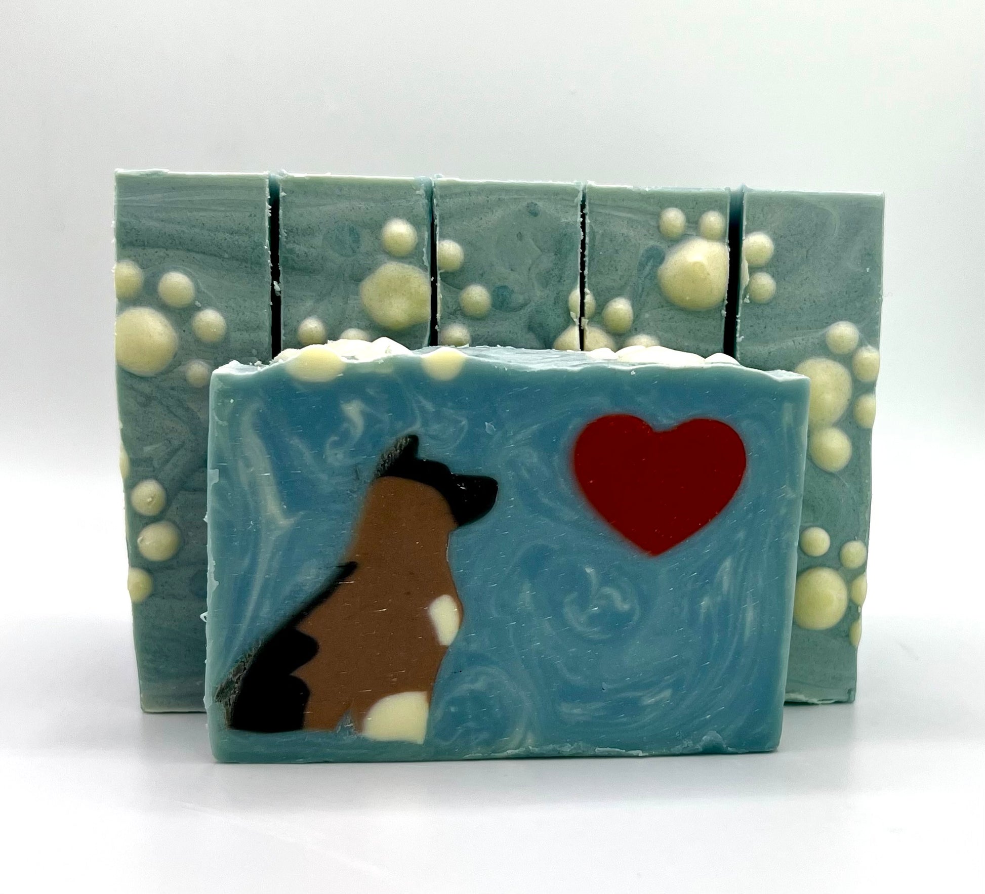 What I like about it: Inception soaps (a soap-inside-a-soap) are multiple day processes. I love this one - the dog is SO CUTE and the blue background just fits. AND THE PAW PRINTS ON THE TOP. SQUEE! Plus I'm a mega dog-lover so I had to add a heart. Because. That's why.